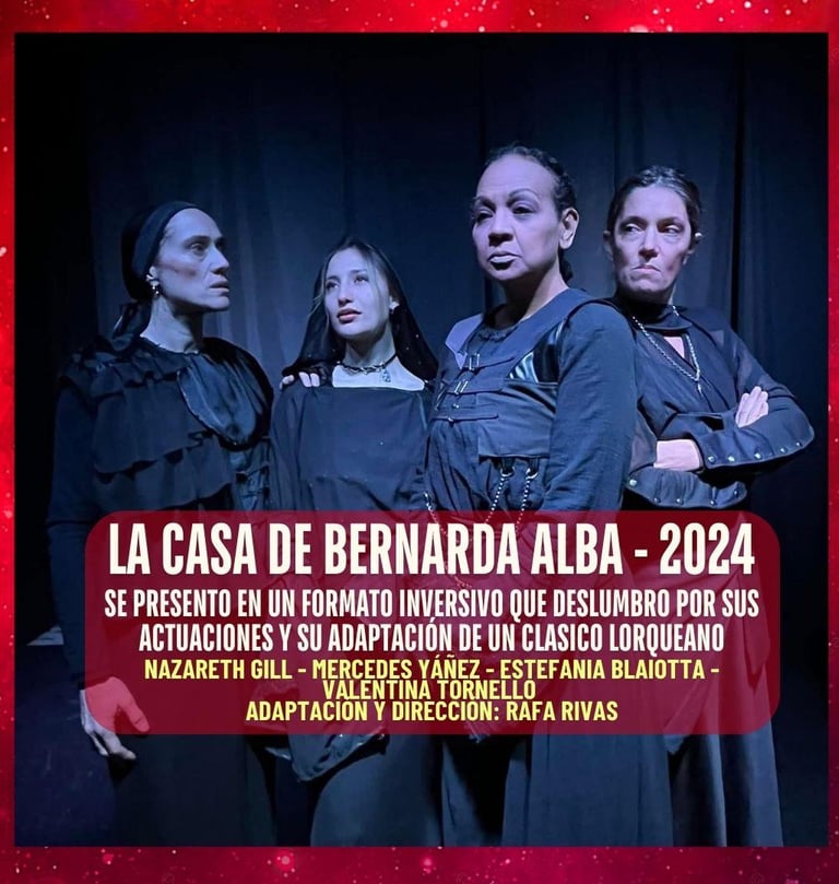 Bernarda Alba es una mujer fuerte, severa e intransigente. Tras la muerte de su segundo marido, impone a sus cinco hijas un luto de ocho años, cortando toda relación con el mundo exterior. La aparición de Pepe el Romano, novio de la hija mayor, desencadena el conflicto. La obra es un drama rural sobre cómo los valores sociales son capaces de aplastar las ansias de libertad.